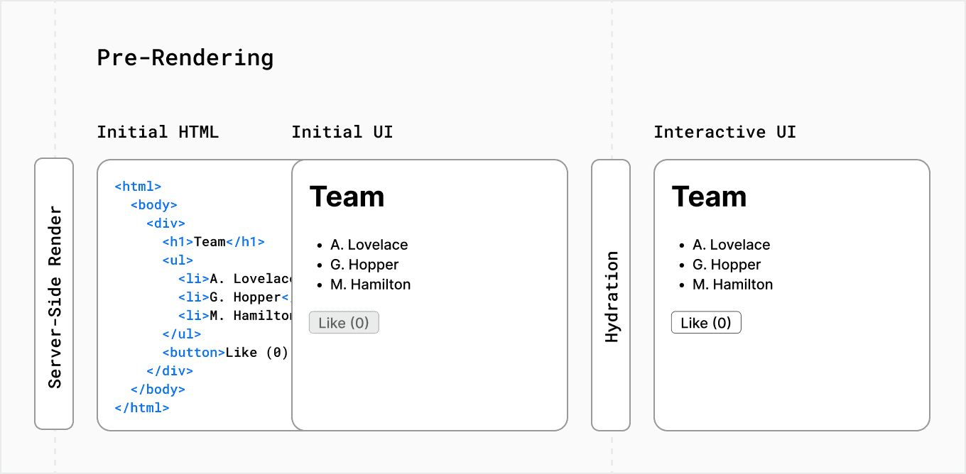 SSG와 SSR은 클라이언트에게 전달되기 전에 데이터를 가져오고, React를 HTML로 변환하는 작업을 수행하기 때문에 pre-rendering이라고 불린다.