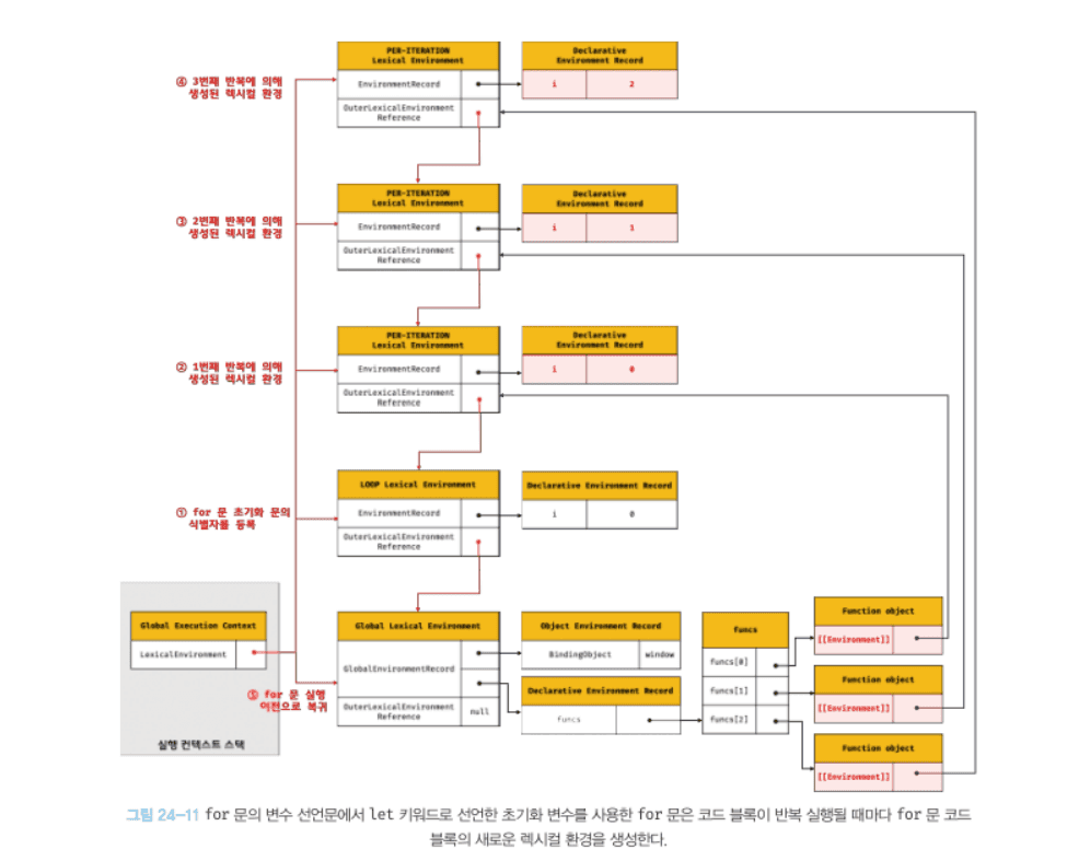 }let 키워드로 선언한 변수를 사용하면 for 문의 코드 블록이 반복 실행될 때마다 for 문 코드 블록의 새로운 렉시컬 환경이 생성된다.