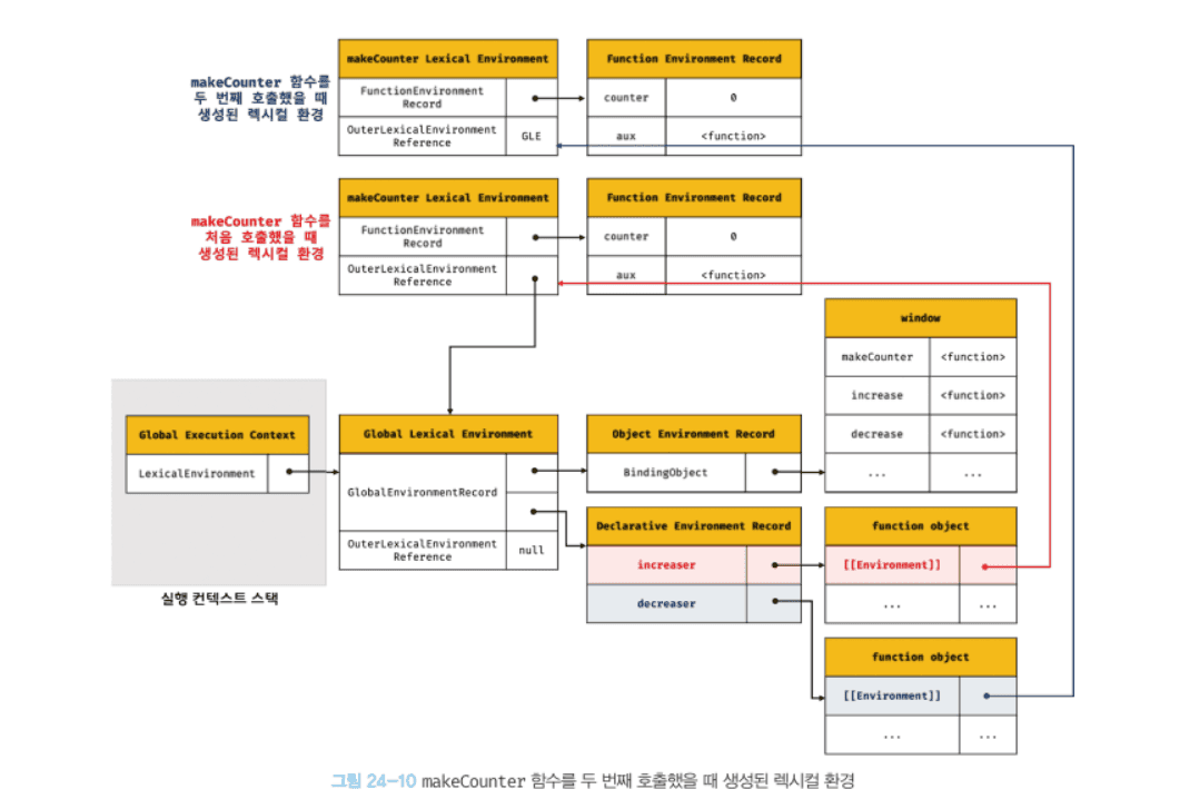 console.log(decreaser()); // -2increaser 함수와 decreaser 함수는 별개의 독립된 렉시컬 환경을 갖는다. makeCounter 함수를 호출하면 그때마다 새로운 makeCounter 함수 실행 컨텍스트의 렉시컬 환경이 생성되기 때문이다.