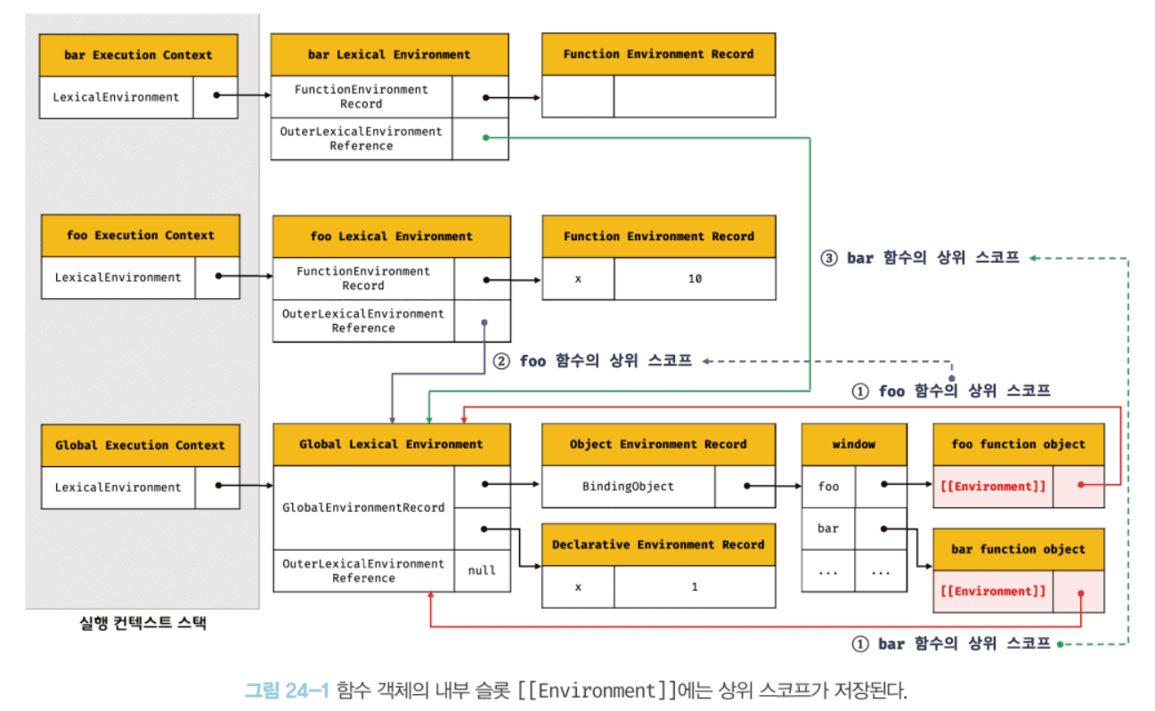 함수 정의가 평가되어 함수 객체를 생성할 때, 함수는 자신의 내부 슬롯 [[Environment]]에 상위 스코프의 참조를 저장한다.