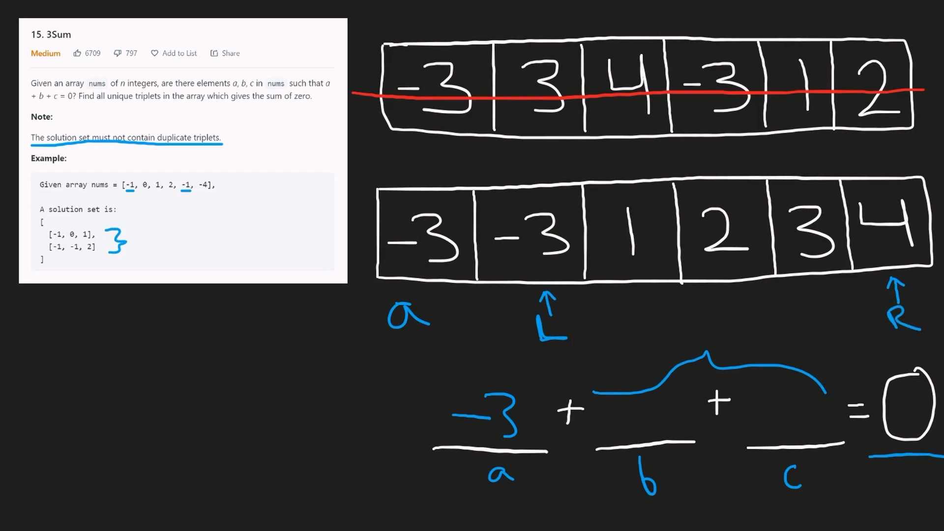 -3(a)을 기준으로 잡고 나머지 [-3, 1, 2, 3, 4] 중 합이 3이 되는 페어를 투 포인터 알고리즘으로 찾아내면 총합 0인 숫자들의 조합을 찾을 수 있다.