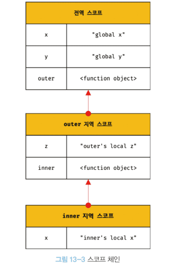 ⇒ 하위 스코프에서 상위 스코프 변수 참조 가능