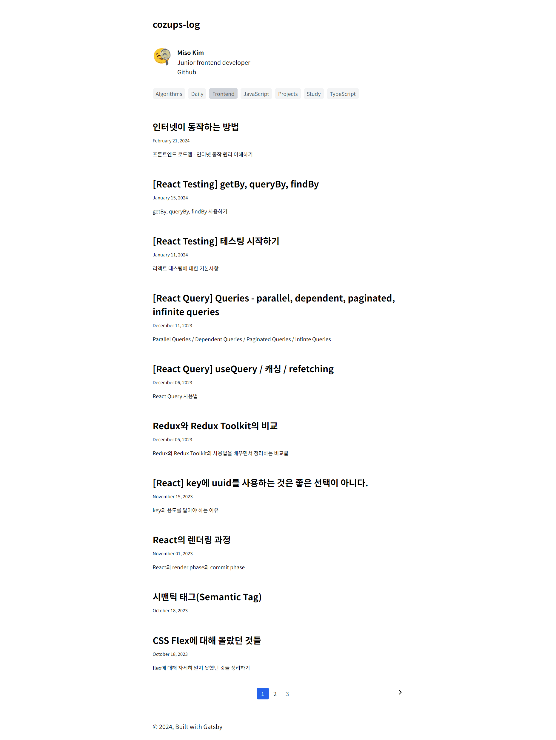 그 후에 src/pages에서 index.js를 삭제한다. index.js를 삭제하는 이유는 createPage 메서드에 지정한 path옵션에 따라 페이지가 1일 때 우리는 블로그 기본 URL(cozups-log.netlify.app)에 접속하게 되는데, 이 때 blog-list.js 페이지와 index.js 페이지가 충돌하여 오류를 일으킨다. 따라서 index.js 페이지를 삭제해야 한다.