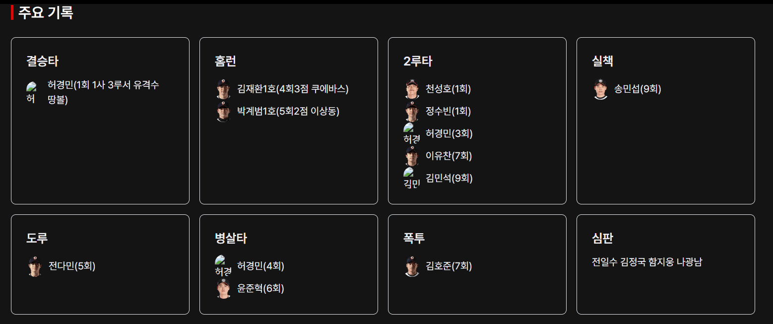 천성호(1회) 정수빈(1회) 허경민(3회) 이유찬(7회) 김민석(9회)이러한 형태를 띄므로천성호, 정수빈, 허경민, 이유찬, 김민석으로 추출될 수 있도록 한다. - 각 선수의 팀을 알아낸다. API를 호출할 때 팀 정보가 필요하기 때문에 알아내야 한다. 해당 경기에 출전한 선수들이기 때문에 KT 기록 내에 있는 선수라면 KT 선수이고 아닌 경우에는 상대 팀 선수이다.