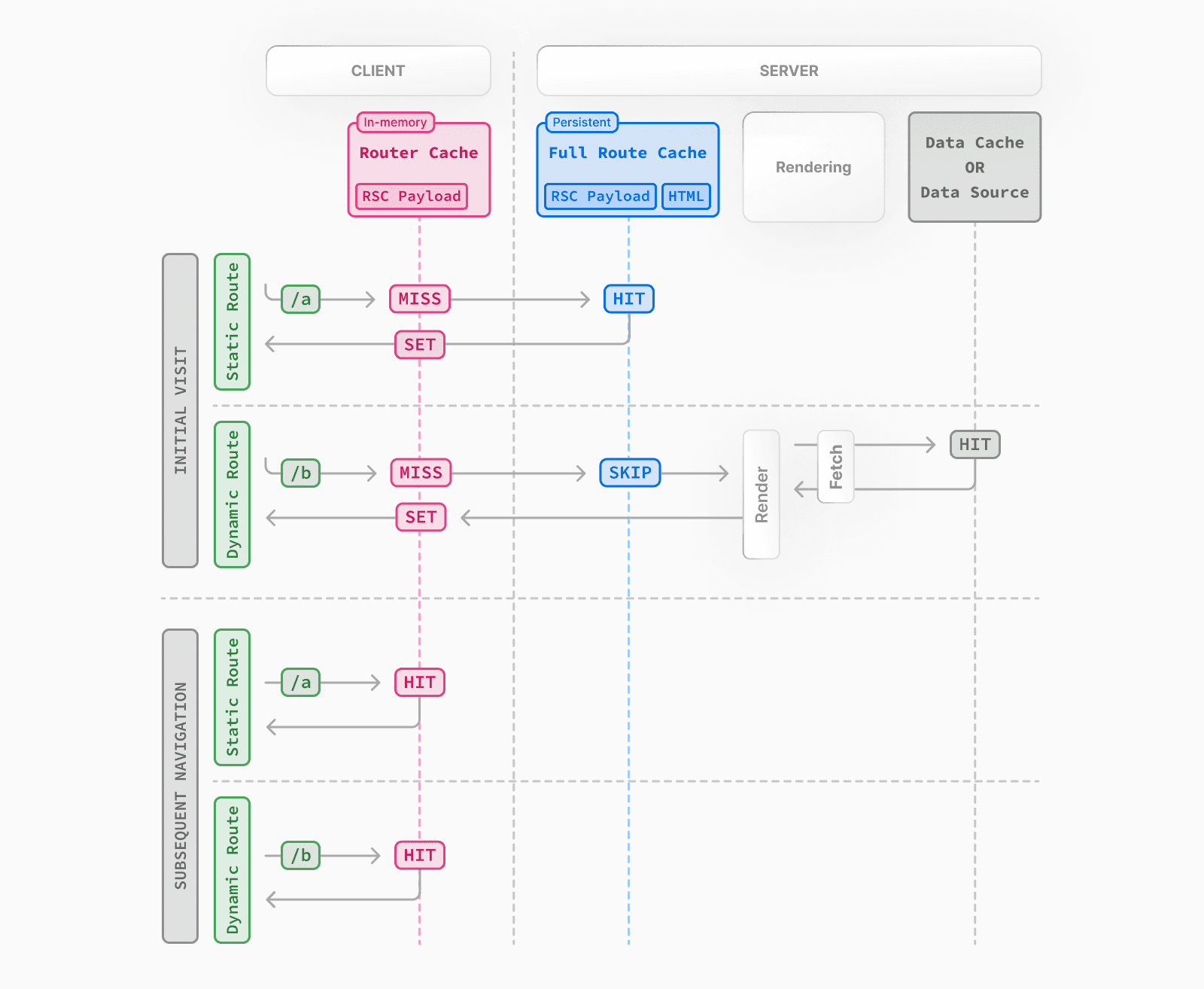 Next.js는 빌드 타임이나 재검증 시, 경로의 렌더링 결과(RSC 페이로드와 HTML)를 서버에 캐시합니다. 이는 요청마다 서버에서 렌더링하는 대신 캐시된 경로를 제공할 수 있는 최적화로, 페이지 로드를 더 빠르게 만듭니다.